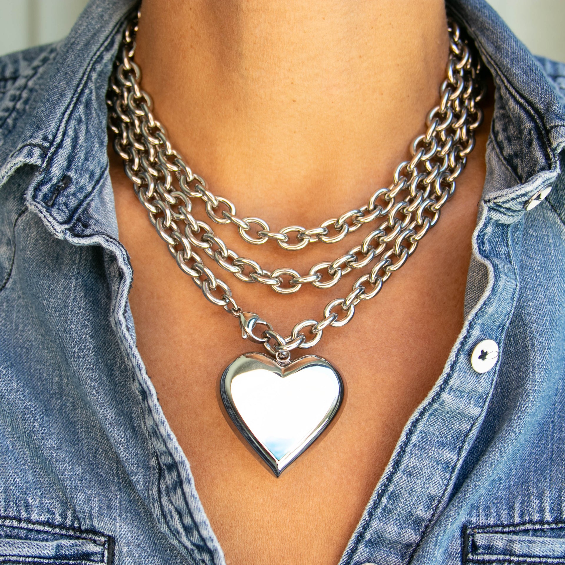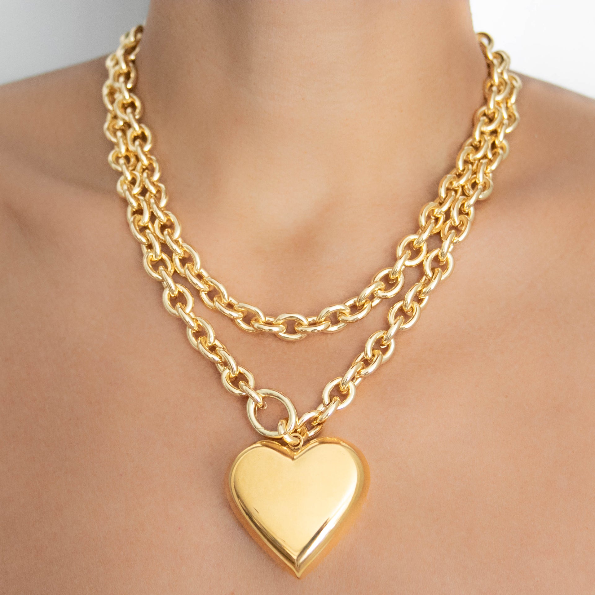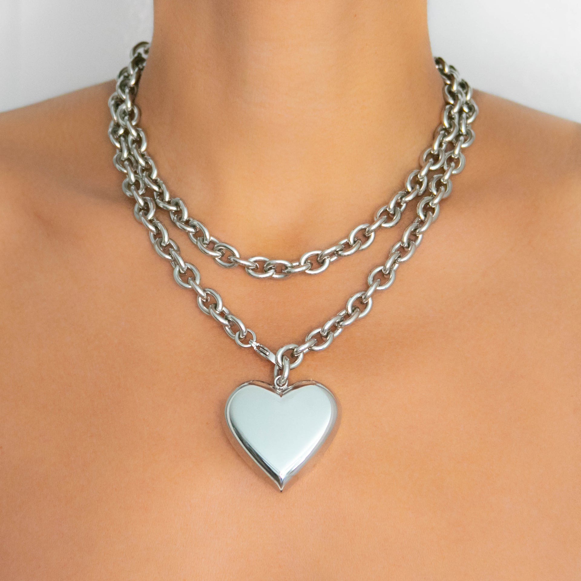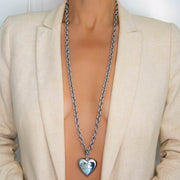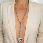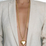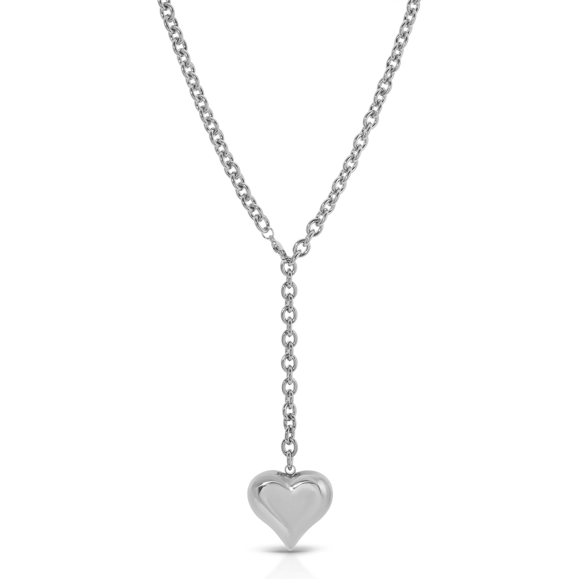 A 36" long versatile piece that can be worn several different ways. As a long necklace, doubled up as two layered necklaces, or as a lariat. Featuring a puffy heart pendant.