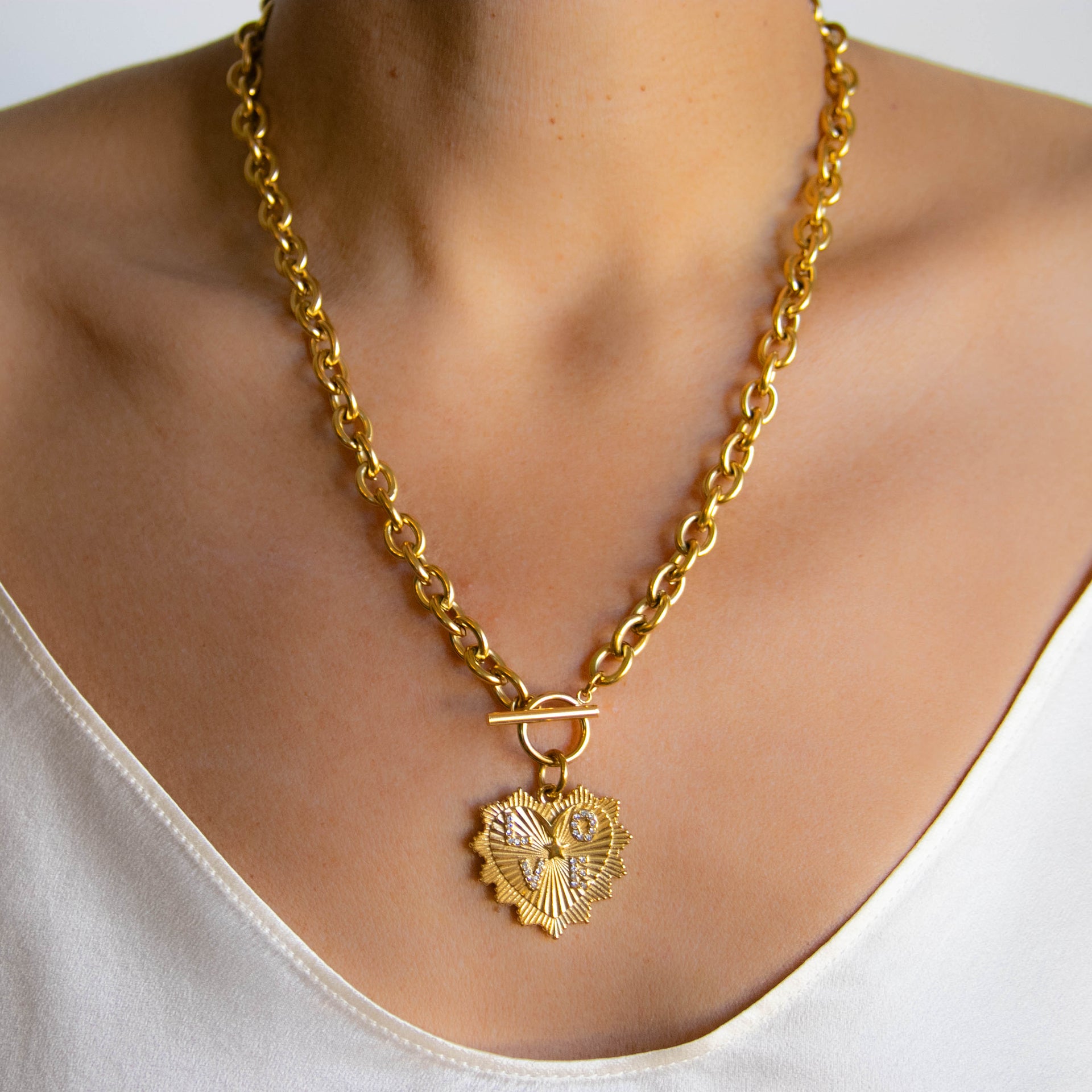 This feminine necklace features a heart pendant adorned with sparkling diamond “LOVE” lettering, finished with a sleek toggle clasp for an effortlessly romantic touch.