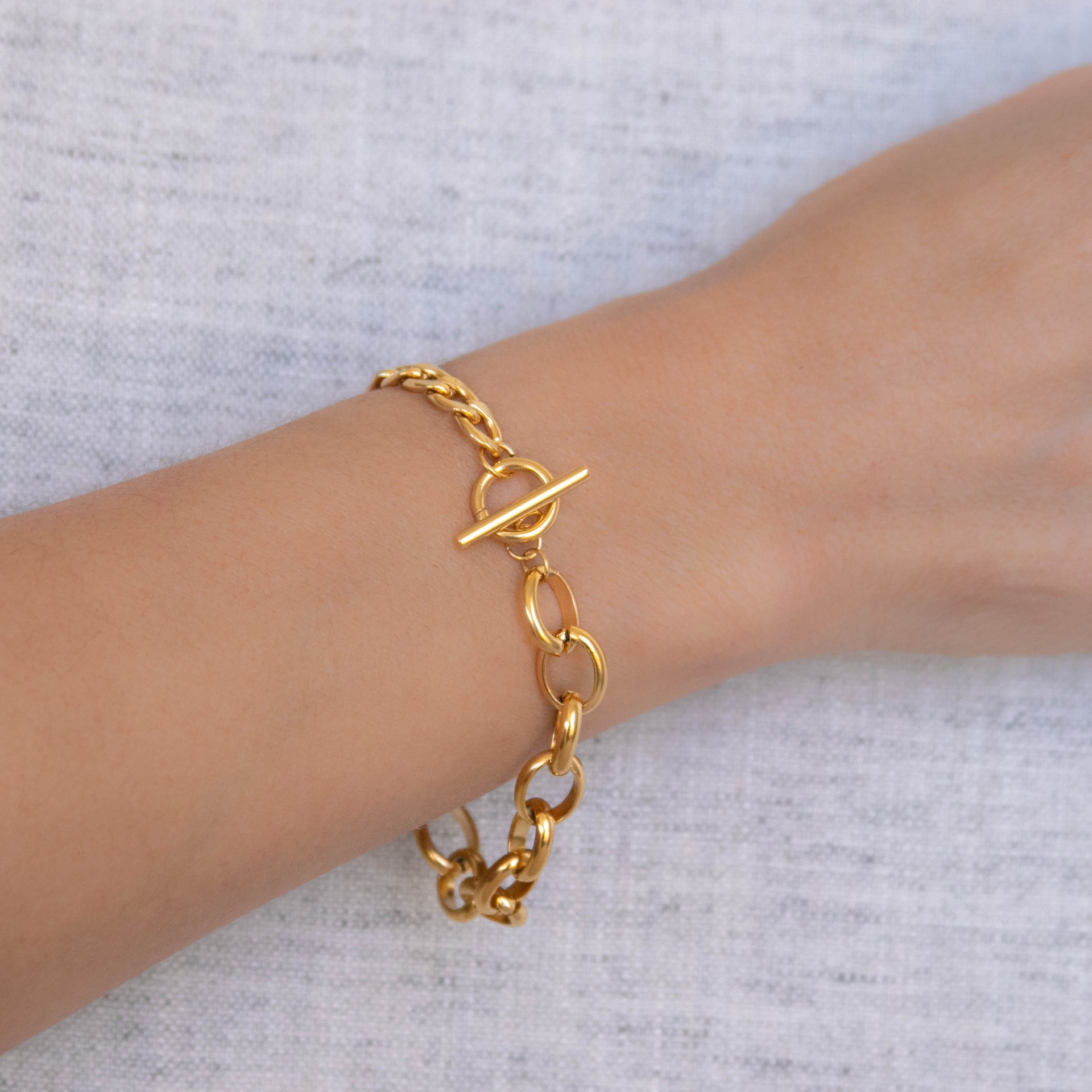 - Rolo link and cuban link charm bracelet, featuring 2 heart charms and a simulated diamond