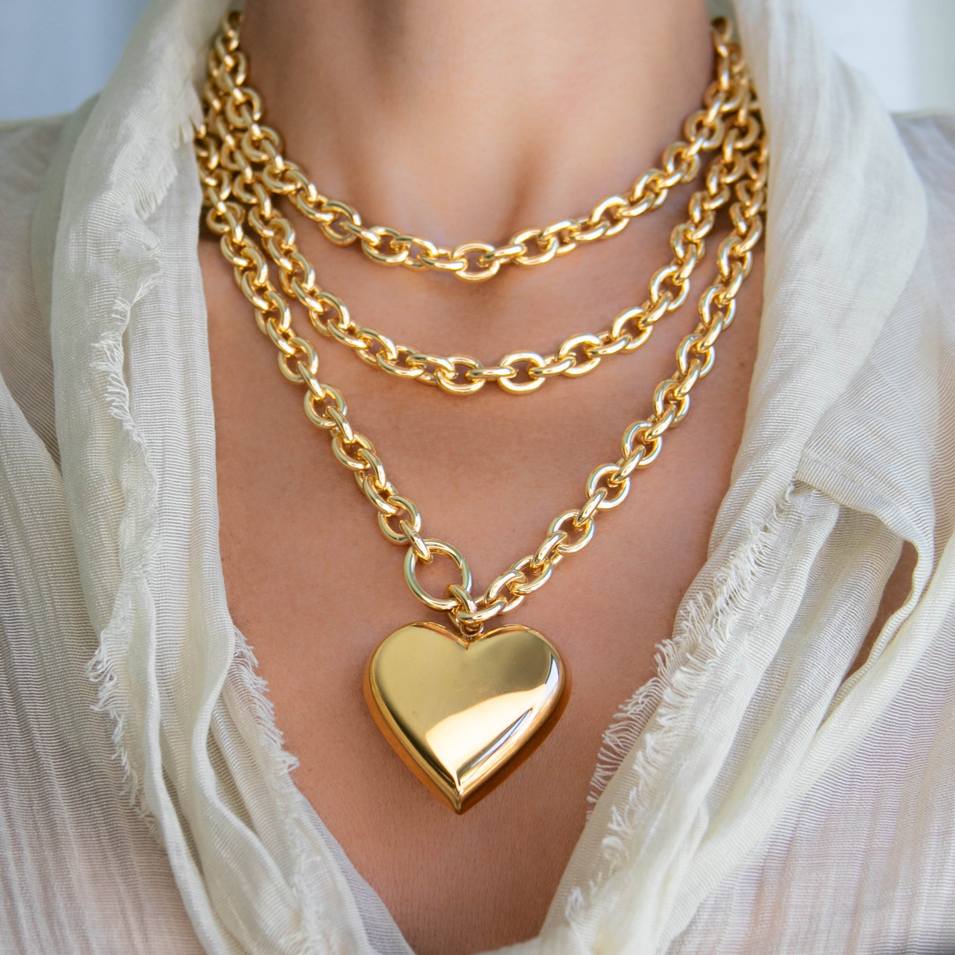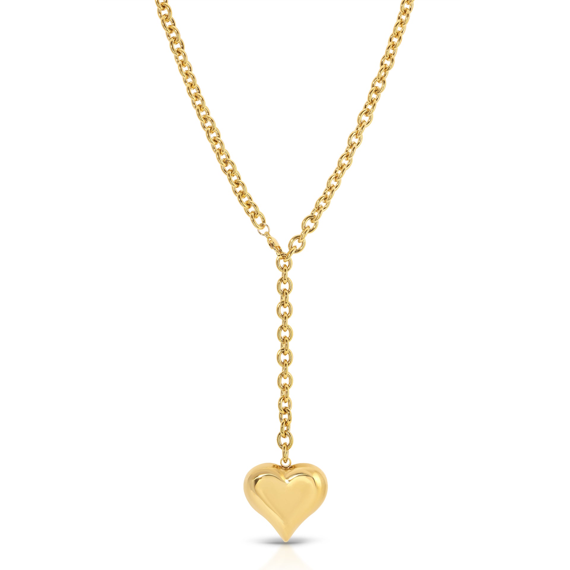 A 36" long versatile piece that can be worn several different ways. As a long necklace, doubled up as two layered necklaces, or as a lariat. Featuring a puffy heart pendant.